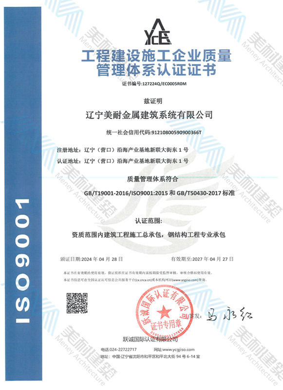 遼寧美耐金屬建筑系統(tǒng)有限公司位于遼寧(營(yíng)口)沿海產(chǎn)業(yè)基地,專(zhuān)注于預(yù)制金屬建筑系統(tǒng)領(lǐng)域,是一家集工業(yè)建筑設(shè)計(jì)、制作、施工及相關(guān)的技術(shù)咨詢與服務(wù)為一體的綜合性服務(wù)企業(yè)。作為國(guó)家鋼結(jié)構(gòu)協(xié)會(huì)會(huì)員、中國(guó)建筑金屬結(jié)構(gòu)協(xié)會(huì)會(huì)員單位與國(guó)家高新技術(shù)企業(yè),美耐建筑集建筑工程施工總承包、鋼結(jié)構(gòu)工程專(zhuān)業(yè)承包等多種資質(zhì)于一身,并擁有22項(xiàng)鋼結(jié)構(gòu)建筑領(lǐng)域?qū)@?項(xiàng)軟件著作權(quán)。
